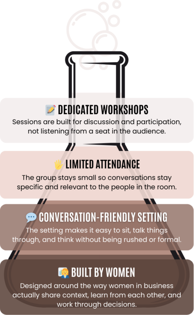 You’ll have time to slow down and get out of your day-to-day, but you’ll also be part of guided workshops, conversations with experienced women in business, and real connection with others who understand what you’re building. The goal is to give you perspective, ideas, and clarity you can take back with you - not a long to-do list.